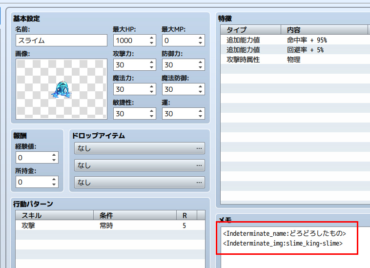 プラグインのヘルプを読めばすぐにわかりますが、やることは、敵キャラのメモ欄に、2行記述するだけ。