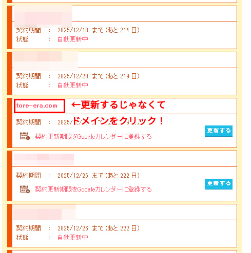 右に表示されている「更新する」ボタンではなくて、赤字になっているドメイン名をクリックします。