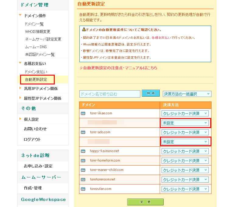 すると、ドメインの右に決済方法が載ってるので、クレジットカード決済などから、未設定を選んで、下の変更ボタンをクリックすれば、自動更新は切れます。