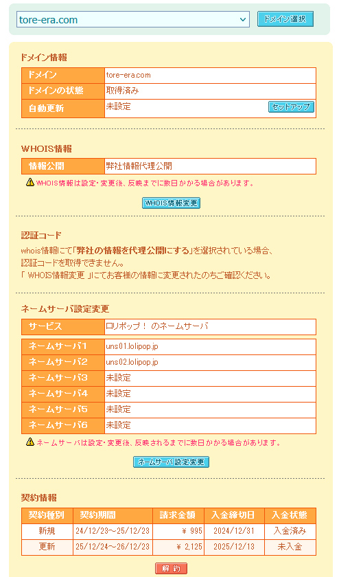 解約したら、戻せなくなるので、くれぐれもドメイン名を間違わないように注意してください。