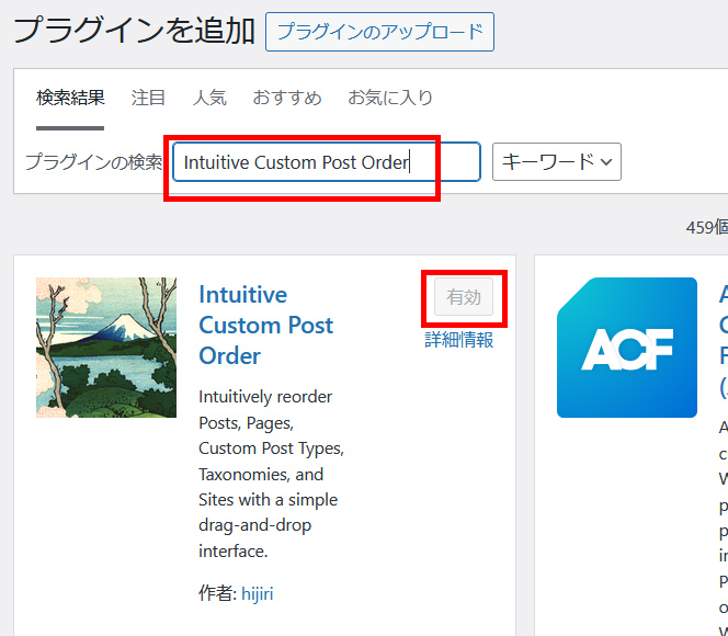 Intuitive Custom Post Orderは、ワードプレスのプラグインの追加から「Intuitive Custom Post Order」で検索すると出て来ます。