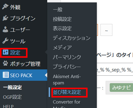 プラグインをインストール後、有効化すると、左のメニューの設定に「並び替え設定」が追加されていると思います。