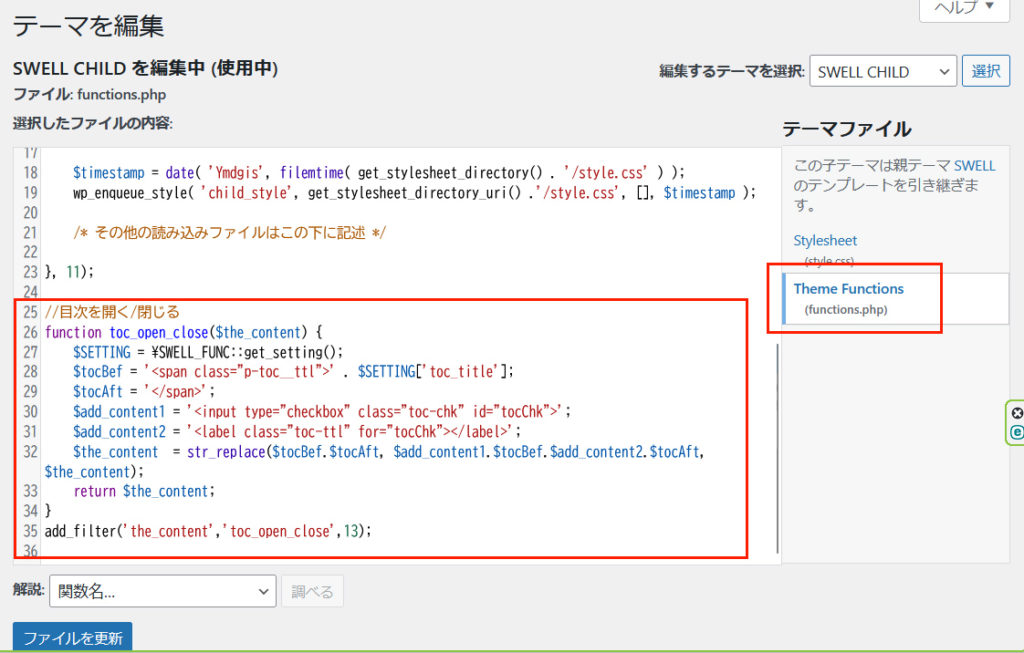まず、目次で開くと閉じるを表示させたいので、以下のコードを、子テーマのfunctions.phpに追記してください。