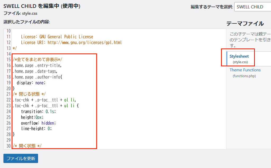 先ほどのfunctions.phpの上にある、style.cssにコピペです。