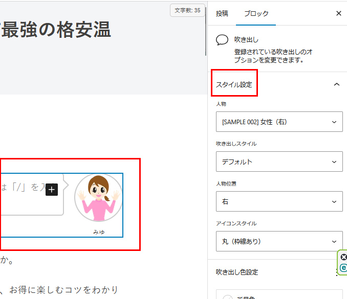 まず、左画面(見切れてますが…)の吹き出しをクリックして、アクティブにしておいてから、右画面のスタイル設定から、人物やスタイル、人物の位置を変更できるようになってます。
